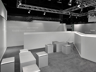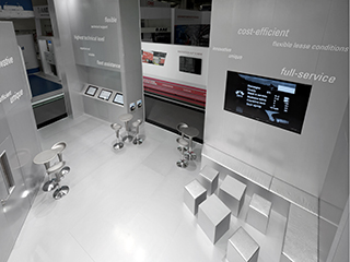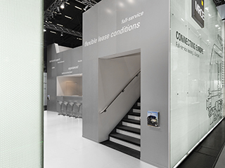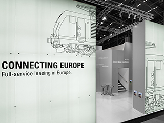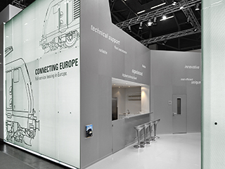 Der Stand besteht außenseitig aus ca. 5m hohen Leuchtstehlen mit linearen Grafikmotiven aus der Eisenbahnwelt. Innen sind alle wandseitigen Oberflächen, sowie die Fußböden mit einer silbernen Oberfläche beschichtet. Es ergibt sich eine edle, monochrome Erscheinung des Standes, welche den Besucher und Kunden in den Mittelpunkt stellt. Darüber hinaus hebt sich der Stand wohltuend von dem bunten Farbenmix der übrigen Messestände ab.