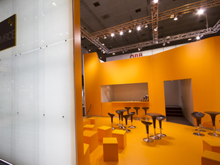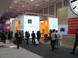 Die äußeren Hüllflächen werden von hinten mit Leuchtstoffröhren beleuchtet, so dass der Messestand von außen die Wirkung eines großen skulpturalen