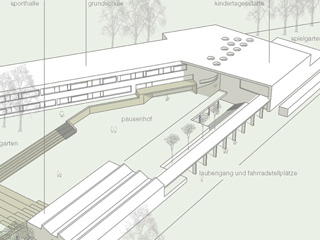 Auszug aus der Preisgerichtsbeurteilung: Die vorgeschlagene, V-förmige Gebäudestruktur beantwortet in schlüssiger und einfühlsamer Weise eine ausgesprochen schwierige städtebauliche Situation im Spannungsfeld von Blockrandbebauung und 60er Jahre Solitär. Das Ensemble von Sporthalle und Kindertagesstätte bildet das städtebauliche Rückgrat zur Wohnbebauung und schirmt sie akustisch ab. Die aufgespannte Gebäudefigur erzeugt einen dynamischen, aber dennoch gefassten Raum, der sich zum Stadtteil öffnet.
