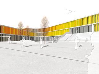 Das städtebauliche Konzept sieht eine Konstellation aus drei Gebäuden vor. Einer zwei- bis dreigeschossigen weiterführenden Schule, einer eingeschossigen Dreifach-Turnhalle sowie der ein- bis dreigeschossigen Grundschule mit Bürgerzentrum und Kita. Die Baukörpern orientieren sich an den orthogonalen Straßenkanten der Da-Vinci-Straße, Grüne Meile, Jensenstraße und Noetherstraße an. Die Gebäude verstehen sich als strukturelle und gestalterische Einheit und fassen mit ihrer geschwungenen freien Form den gemeinsamen Innenhof. Es wird ein solitäres Zentrum geschaffen, das sich bewusst von der Blockrandbebauungen der bestehenden Bebauung distanziert.
