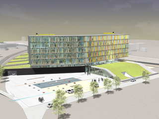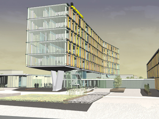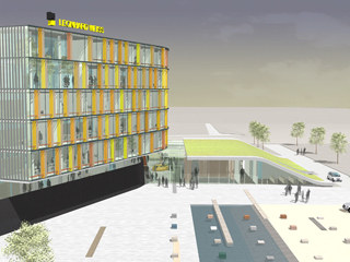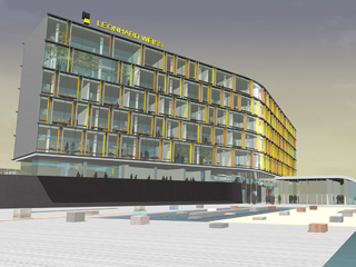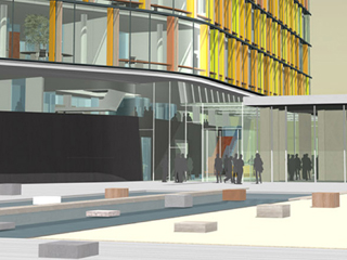 Auf einem dreieckigen Grundstück plant die Leonhard Weiss Bauunternehmung ein neues Verwaltungsgebäude. Der Entwurf sieht eine hohen Baukörper vor und drei weitere niedrigere Baukörper als Erweiterung. Die Schotten zwischen den einzelnen Fensterelementen repräsentieren Farben des Leonhard-Weiss CI. Dadurch erscheint die Fassade bei vertikaler Betrachtung maximal transparent, und verdichtet sich bei einem flachen Betrachtungswinkel, so dass eine große, in gelbtönen eingefärbte Fassadenfläche entsteht.