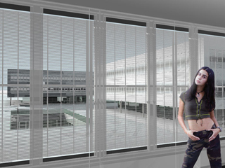 Die Fassade erfüllt eine kombinierte Sonnen- und Blendschutzfunktion. Sie besteht aus zwei Edelstahl-Lochblechebenen, die angehoben oder abgesenkt werden können. Die beiden Bleche werden so hintereinander versetzt, dass das direkte Sonnenlicht nicht in den Raum hineingelangen kann.